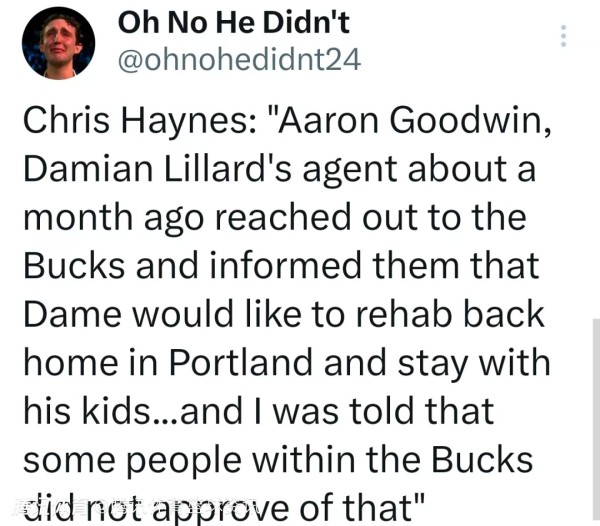 北京时间7月2日,名记Chris Haynes在节目中谈及利拉德和雄鹿的关系。Haynes表示:“利拉德的经纪人古德温约一个月前曾联系雄鹿,告知他们利拉德希望回波特兰老家康复,陪伴孩子。但我听说雄鹿内部有人对此表示反对。”