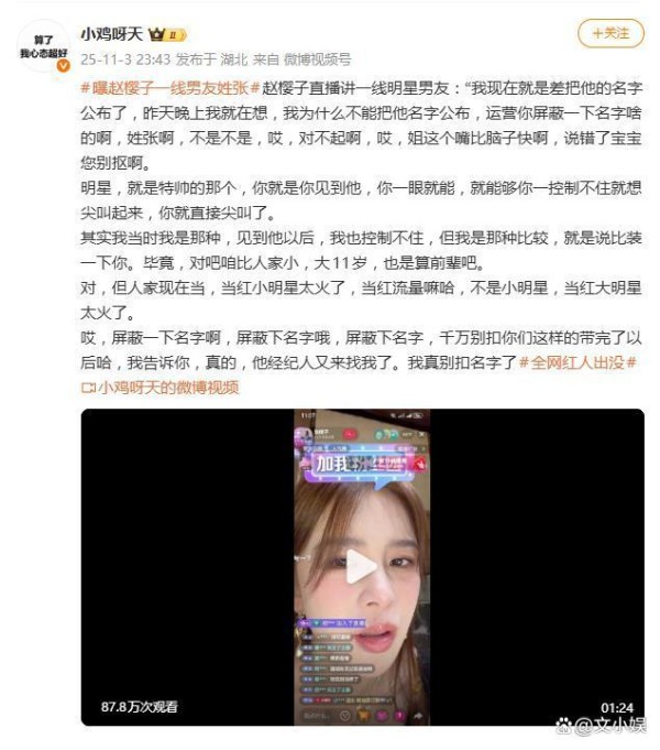 据网友11月3日晚间爆料,赵樱子在直播中一番“差点公布男友名字”的操作,直接让吃瓜群众集体沸腾。她一边要求“屏蔽名字”,一边又“嘴比脑子快”地脱口而出“姓张啊”,紧接着紧急改口,还坦言“他经纪人又来找我了”——这波自曝加遮掩的戏码,堪称直播版“欲盖弥彰”。