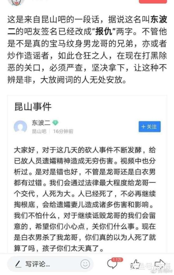 昨日,有网友发现,在网上的“昆山吧”,有自称是昆山龙哥的兄弟发帖称: