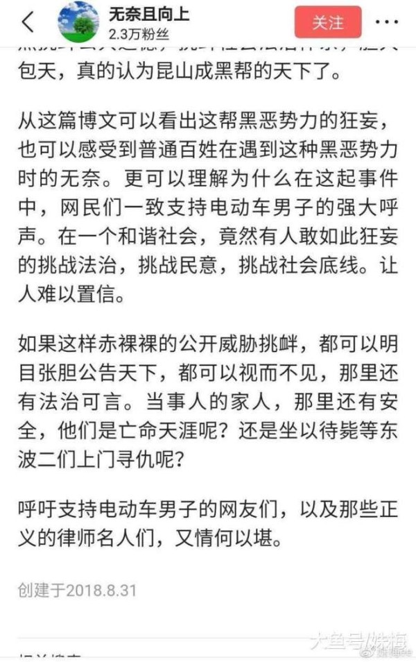 这段文字可以看出黑社会恶势力的狂妄,也可以感受到普通百姓在遇到这种黑恶势力时的无奈。更可以理解为什么在这起事件中,网民们一致支持电动车男子的强大呼声。在一个和谐社会,竟然有人敢如此狂妄的挑战法治,挑战民意,挑战社会底线。让人难以置信。