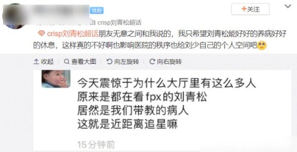 这位粉丝还发了一个信息截图出来,应该是来自医院的工作人员,信息表示医院来了很多人追星,并且点名追的是FPX刘青松,这样的情况也是非常不可取的。