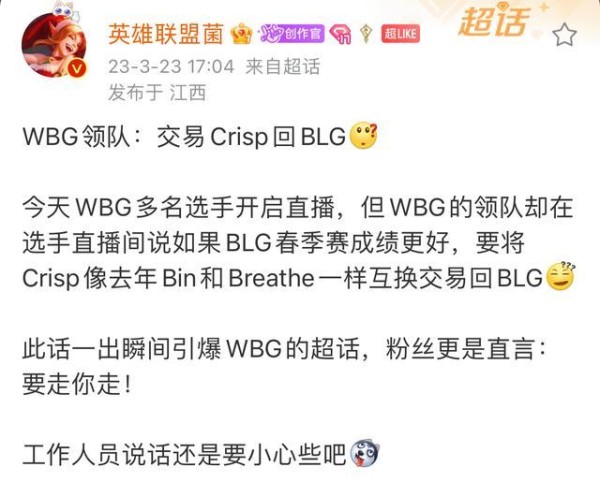 大家好,S13赛季的比赛绝大多数多数的,相信绝大多数的玩家都关注了最近一段时间的春季赛,lpl赛区的对抗还是比较激烈的。W bg战队作为大家非常关注队伍,在之前的对抗中就已经确定了季后赛的名额。但是因为战队选手的人气和热度非常的高,导致目前w bg战队出现了很多的过激行为,甚至战队粉丝已经和战队的管理层发生了严重的矛盾。在最近的直播过程当中,w bg战队的领队竟然公开的表示,如果blg战队的成绩更为出色的话,那么在春季赛结束之后,就会效仿之前rng战队和blg战队的操作进行辅助选手的更换。
