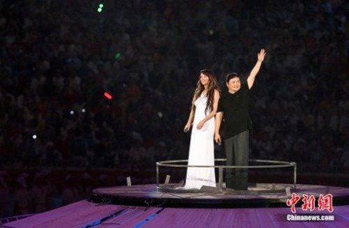 资料图:2008年北京奥运会开幕式上,刘欢和莎拉·布莱曼演唱主题曲《我和你》