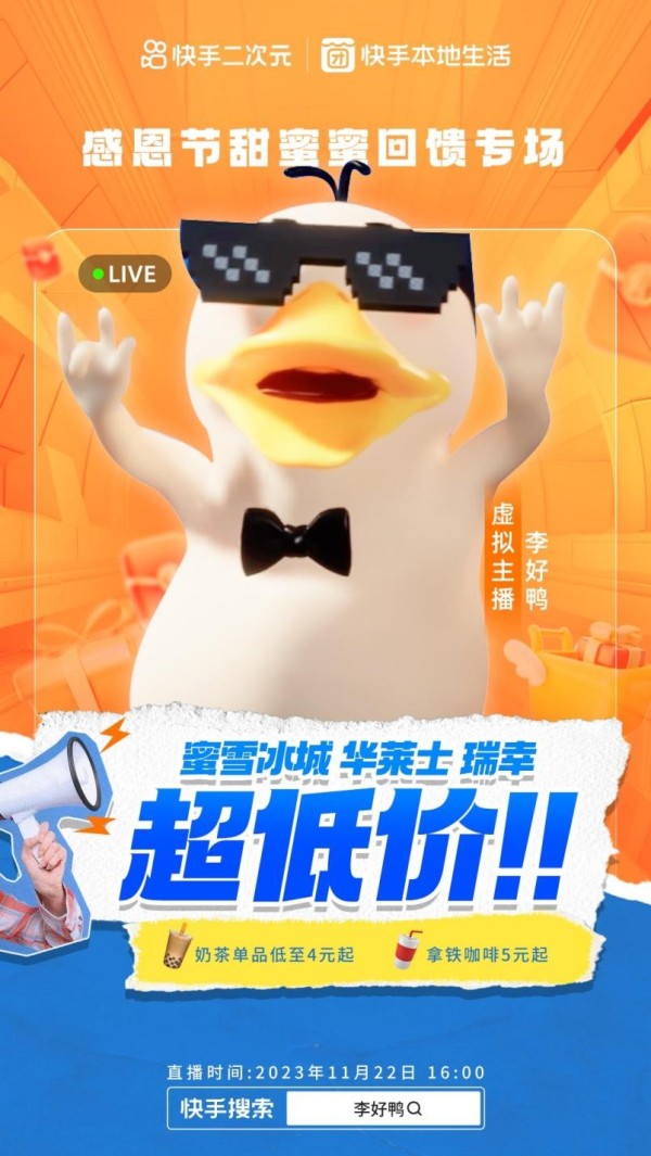 随着年轻且拥有强烈民族自豪感的新Z时代人群不断崛起,全新的商业机遇正不断涌现。近日,一场连接年轻消费力量与本地生活商家的带货直播在快手上演——快手二次元独家虚拟主播@李好鸭 联动蜜雪冰城、华莱士等品牌,开启感恩回馈专场,以“全虚拟场景交互+虚拟物品讲解”的创新形式,助力国货品牌占领新Z时代用户心智,打开增量新空间。