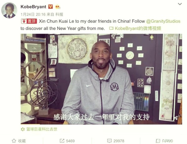 去年,科比曾深情地写道:“祝中国70岁生日快乐!感谢这个迷人的国家始终对我敞开胸怀!你的学习精神和不断进步的姿态,每天都深深激励着我!我深爱着你,中国!”