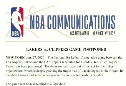 由于湖人队球员深陷悲痛之中,情绪难以平复,无法参与正常比赛,因此,原定于1月29日举行的洛城德比战被迫无限期延后,具体比赛时间待定。
