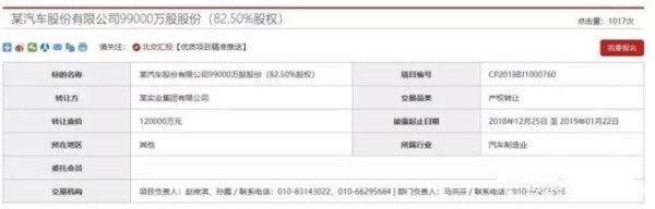 时隔两年,2018年11月25日北京产权交易所挂牌信息显示,某汽车股份有限公司的82.50%股权正在公开转让,转让底价为12亿元,截止时间为1月22日。