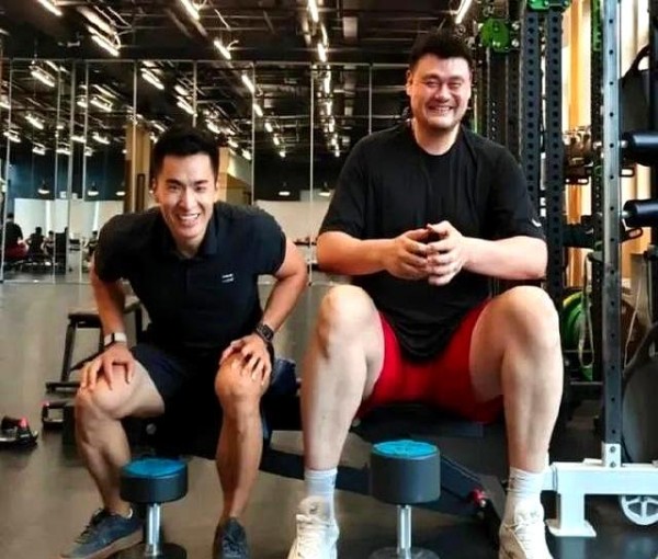 照片里的姚明笑得很开心,的确比以前瘦了一大圈。