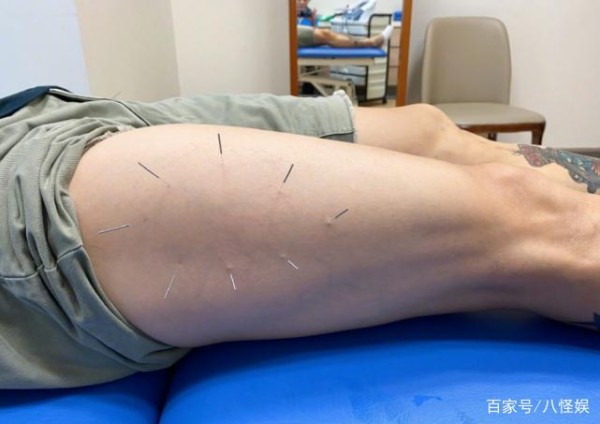 照片中,吴尊头戴棒球帽,身穿黑色T恤卡其色短裤,躺在诊疗床上,右腿大腿处扎了一圈针,看着都疼。