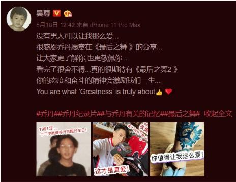 3天前,NBA“篮球之神”乔丹的纪录片《最后一舞》在第十集拍摄结束之后,就算是完结了,这一部记录了乔丹篮球生涯的纪录片成功以每集平均560万的收视率创下ESPN的收视记录。吴尊作为娱乐圈中乔丹的忠实粉丝,也是发微博向乔丹致敬,晒出了他收藏的乔丹球衣。
