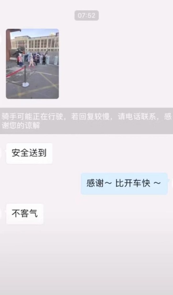 彭女士介绍,3月1日开学第一天,起来有一点晚了,学校门口有点堵车,“想着跑腿可能比开车快一些,就在平台上下了个订单。平时大概是10分钟的车程,那天不到10分钟就到了。”彭女士表示,儿子读一年级,这也是自己第一次使用跑腿送孩子上学,“也没有担心安全问题。”当天骑手把小朋友送到后,给彭女士发了消息并附上照片:安全送到,彭女士回复,“感谢,比开车快。”