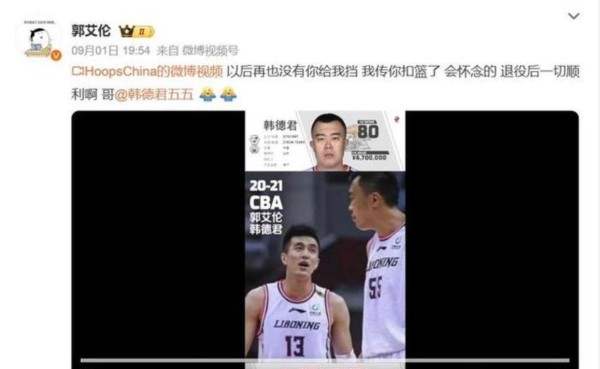 中国男篮巨星郭艾伦真懂人情世故,辽宁男篮官宣韩德君退役,他立马转发助攻扣篮视频、一句“哥”戳中球迷泪点,展现兄弟情深与真诚尊重