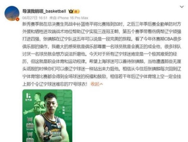 看到张镇麟那一句“永远是辽宁人”的话,突然感觉这些话一出来,就像抽了我一巴掌。你说他心里还是有辽篮球队,有牵挂,没错,但我们都知道,现实远没有他说的这么简单。一个人在外漂泊几年,想念故乡、想念家乡的味道这都很正常,尤其是像辽宁篮球那种文化根深蒂固的地方,哪儿都难舍。但问题是,你的“永远”还真是不是你说了算的事。