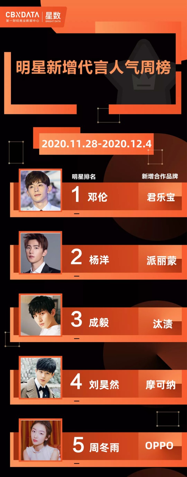 CBNData星数全新发布“明星新增代言人气周榜”及“明星代言周报”,聚焦美妆个护、食品饮料、家电3C、服饰鞋包、日化家清五大品类。