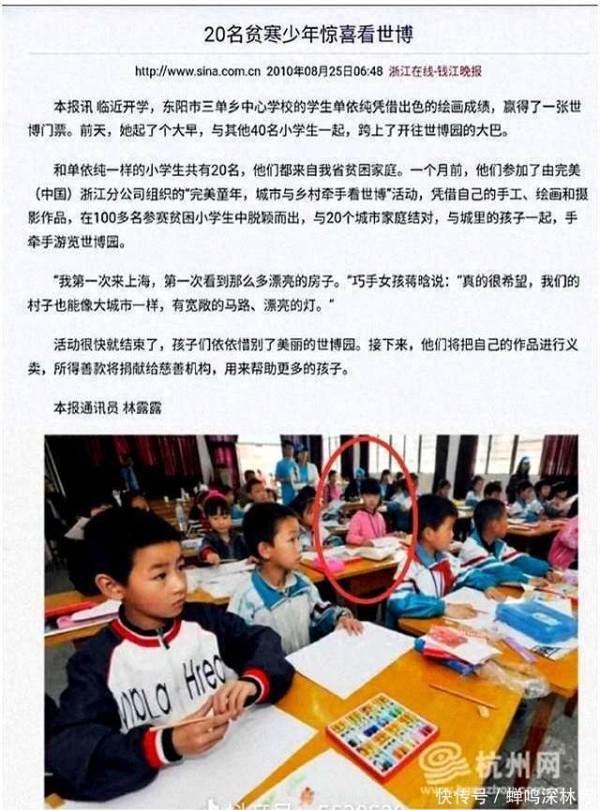 报道中,年幼的单依纯凭借着出色的绘画成绩,赢得了一张宝贵的上海世博会门票,而与她同行的,都是来自浙江省的贫困家庭的孩子。