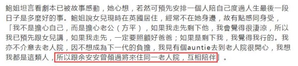 谈及晚年的生活,鲍起静并不认为在养老院就代表晚景凄凉,她表示已经和朋友余安安约好,将来住进同一间养老院作伴,身边有个熟人能够聊天解闷,同时也可以彼此照应。