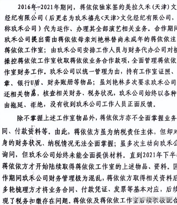 作为童星出道的小明星,蒋依依今天来之不易。现年22岁的她,很难说所报道的事件是否会彻底毁掉她的职业生涯。针对此事,蒋依依工作室发布了解释信。蒋依依承认税务局发出的通知属实,并表示自己已主动缴纳所得税和滞纳金。但对于责任归属,蒋依依工作室表示很冤枉。在解释信中,他们提到了蒋依依与前公司合作的背景。解释信称,2016年至2021年,蒋依依与原公司签订合同,该公司负责其所有演艺相关业务。合作期间,因蒋依依未成年,原公司以此为由要求蒋依依母亲注册成立蒋依依工作室,但财务管理实权一直掌握在原公司手中。蒋依依的母亲试图亲自处理蒋依依的财务和税务问题,但原公司从未给予正面回应,因此他们并不了解蒋依依的纳税情况。直到2021年下半年,蒋依依才陆续获取相关信息,发现扣缴税款问题,并积极配合相关税务机关解决。此外,蒋依依工作室强调,“未提及2019年之前的逃税情况,仍抱有侥幸心理”的说法纯属捏造,没有事实依据。就是用谣言诽谤蒋依依。