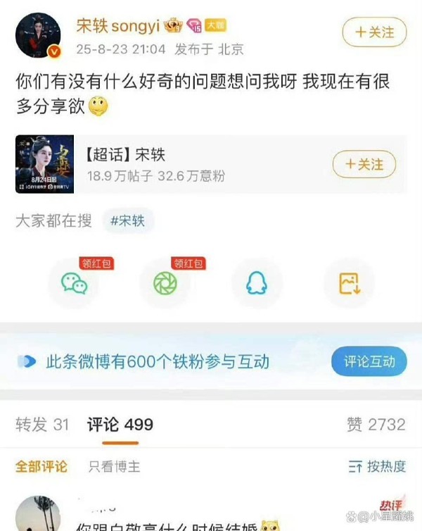 紧宋轶和白敬亭也被卷因是宋轶宣传新剧时,粉丝问“什么时候跟白敬亭结婚”,她没回,还删了动态。