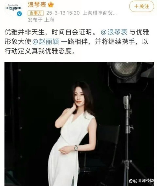 赵丽颖的经历则证明了时间是最好的证明。2017年,她因迪奥广告英文发音问题陷入舆论漩涡,网络上充斥着嘲讽之声。面对这一危机,浪琴表却逆势而行,不仅没有撤下她的广告,反而以“优雅并非天生,时间自会证明”力挺赵丽颖。这简短有力的十个字,既契合了腕表品牌的“时间”属性,又表达了对赵丽颖成长潜力的坚定信心。这一公关策略成功将公众焦点从赵丽颖的“不足”转向了她的成长潜力。浪琴给予了赵丽颖全球最高代言头衔的待遇,双方互相陪伴了七年,见证了赵丽颖从被质疑到被认可的全过程。