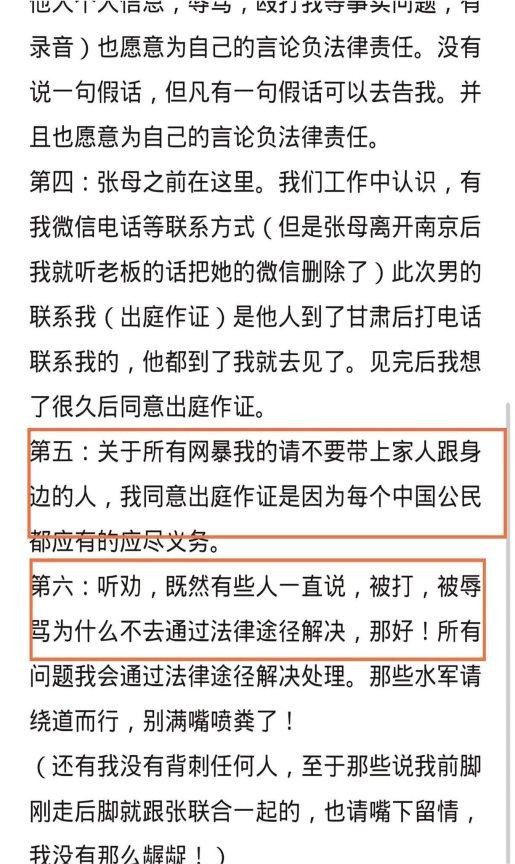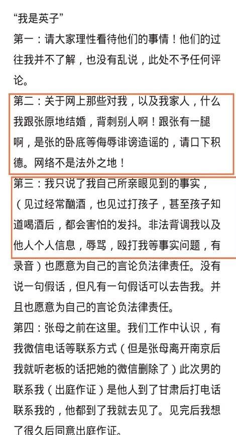 她表示自己对张海波和樊小慧之间的往事并不知情,并强调网络上关于她与张海波有私情的传闻纯属捏造。第三条和第四条分别描述了樊小慧的真实性格,以及她对前婆婆的态度。