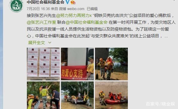 接到张艺兴先生@努力努力再努力x “钢铁贝壳抗击洪灾”公益项目的爱心捐款后,@张艺兴工作室 联合@中国社会福利基金会 在第一时间开展工作,为受灾地区人民以及抗洪救援一线人员提供生活物资包以及防疫物资包。为了延续这一份爱心,中国社会福利基金会在此发起“与受灾群众共渡难关”的线上公益项目,希望能有更多人加入此次行动,帮助受灾的群众重建家园。