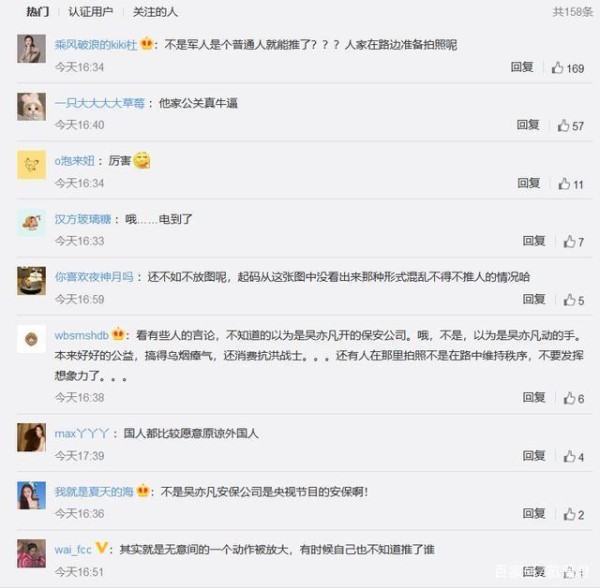 只见一位身着军装的人被吴亦凡的保镖粗鲁地一把推开,先不论对方是否为军人,吴亦凡的保镖这样的动作是不是略显粗鲁。有人说,吴亦凡赶时间,但是事实却是吴亦凡是较早到场的明星,所以不存在赶不赶时间的问题。
