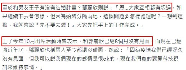 然而,由于疫情的影响,这对异地恋的情侣相见变得困难重重。王子在去年10月出席活动时透露,他们已经长达8个月未曾见面。邓丽欣在12月接受采访时也坦言,虽然两人曾讨论过结婚的事宜,但现实的 距离问题——只能通过视频交流,成为了他们婚姻之路上的主要障碍。
