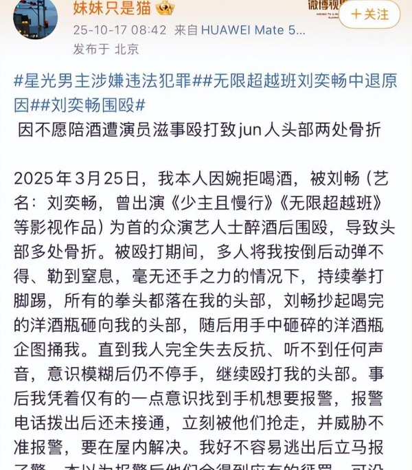 10月17日,有个网友在社交平台上发帖,说男演员刘奕畅对她动手,把她打成了头部两处骨折。