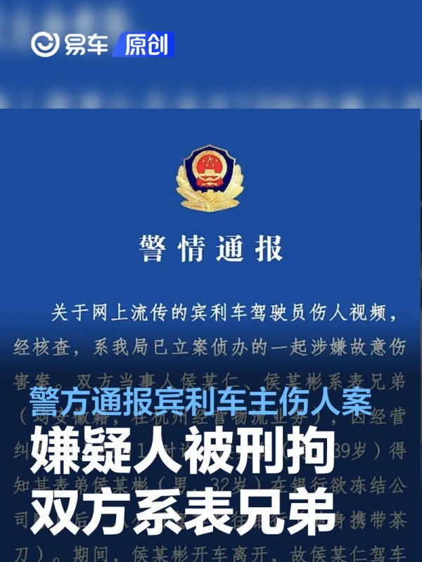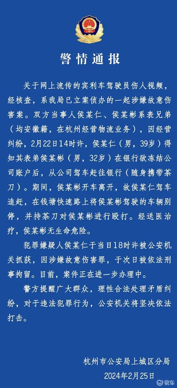 易车讯 2月25日,杭州上城警方通报宾利车主伤人案:宾利车主已被刑拘,两人系表兄弟。