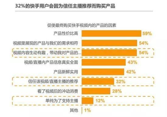 《2019快手直播生态报告》报告显示,32%的快手用户因为信任主播的推荐而购买产品。