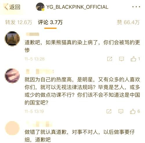 中国网友对Blackpink的行为表示不满,有要求道歉的留言,同时也有网友认为园方和节目制作方应负更大责任。今日,有网友在BLACKPINK的官方微博下留言,要求其就违规接触熊猫的行为道歉。