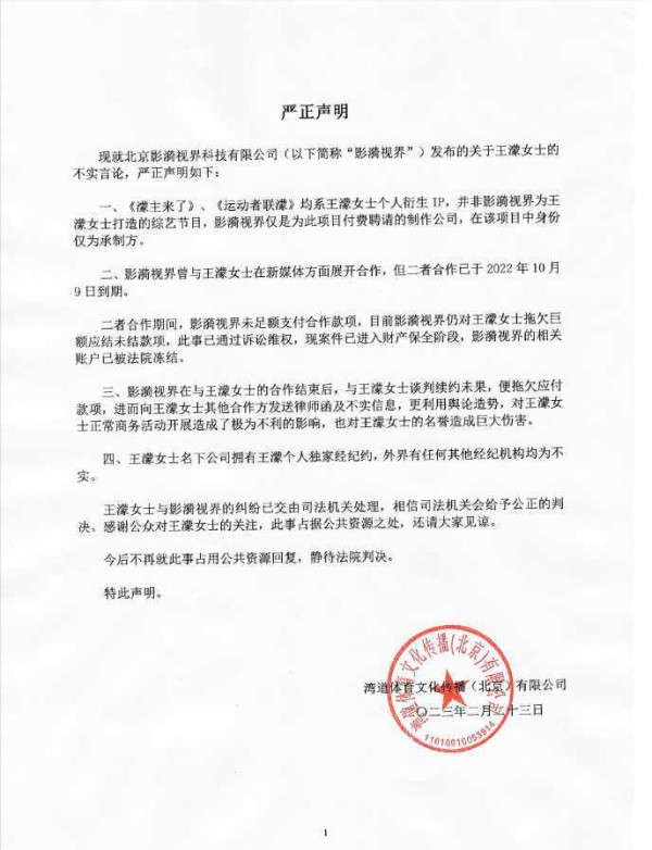 2月23日,影漪视界公司发文称王濛在签约了新媒体领域独家经纪合作期间,多次违反合同约定,擅自参加新媒体领域的商业活动,多次催告无果。