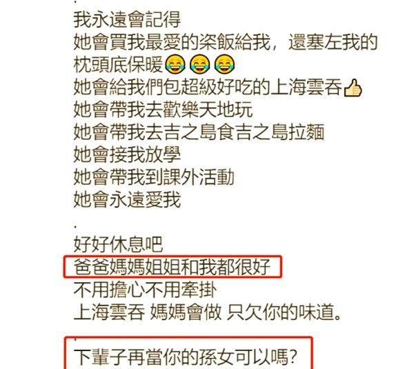 王子涵还深情回忆起与外婆的往昔时光,那些外婆为她精心准备的美味佳肴,以及放学后接她回家的温馨场景,都历历在目。最后,她安慰外婆不必担忧,表示自己和家人都一切安好,并满怀期待地许下心愿,希望来生还能成为外婆的孙女。