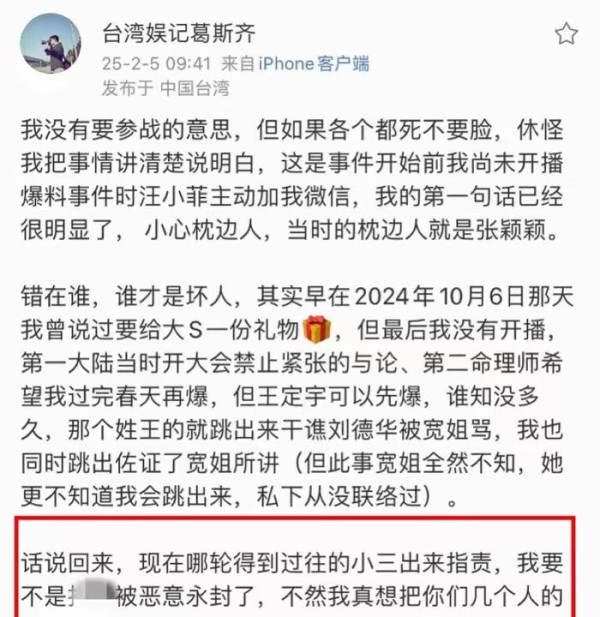 葛斯齐一直在事件中插话,认为在关注大S去世的同时,事情的真相不应该由张颖颖这样的小三来发声。