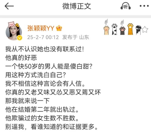 为了进一步证明自己的立场,张颖颖提及汪小菲在婚姻第二年就出轨过,甚至“欺骗了很多女生”。