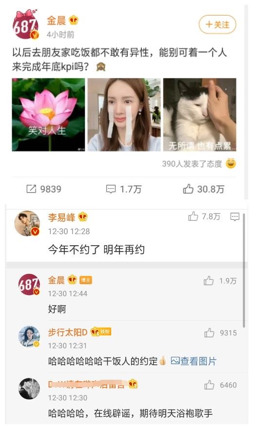 12月30日,金晨和李易峰吃饭被拍后,两人被传出了恋爱绯闻,随后两人纷纷进行了辟谣,金晨更是无奈表示:“以后去朋友家吃饭都不敢有异性,能别可着一个人来完成年底kpi吗?”金晨还配了三个表情包,其中一张就是自己的表情包,这个回应真的是太可爱了,也很好的表达了自己和李易峰只是朋友关系,对于金晨的发文,李易峰留言:“今年不约了,明年再约。”“干饭人的约定”成功的逗乐了围观群众。