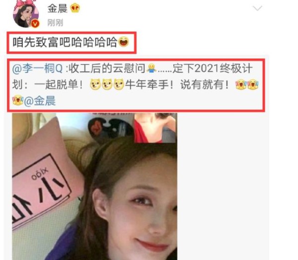 在元旦的时候,李一桐在社交平台喊话金晨,与她相约在2021两人要一起脱单。但金晨或是因为参加情感观察节目,最终与男嘉宾没有走到一起,所以在回应李一桐约定的时候不敢接话,只是推脱着说要先致富。