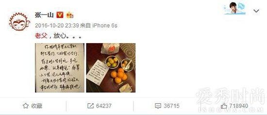 2016年10月20日深夜,张一山在微博晒出一张父亲的手写信,信中称张一山为“小儿”,嘱托张一山坚持吃药多吃水果,换床罩的日常琐事也不放过,言语朴实却细致入微。张一山也回应称“老父,放心”。