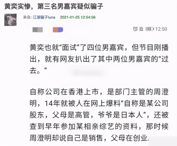 但以为这就结束了吗?不存在的,随后有人爆料,黄奕之后还约会了四个男嘉宾,但是这四个男嘉宾有三个都翻车了,现在才翻车到第一个呢,后面还有两个不靠谱的男嘉宾,黄奕这是在参加综艺还是在渡劫?