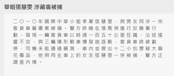 加入TVB后,她第一套参演的剧集便是《On Call 36小时》,有不少观众留意。后来,她在《寒山潜龙》及《收规华》中也有不错表演。 可是在2012年,张慧雯曾卷入藏毒风波!