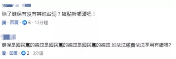 针对台陆委会的说法,有岛内网友批评称,“真悲哀”,连她们违反哪条法律还在想,先恐吓再说。也有网友批评苏贞昌,“除了健保有没有其他台词?搞点新噱头吧!”“她依法缴费依法享用有错吗?”