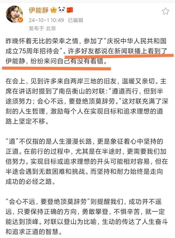 国庆那天,伊能静在社交媒体上亲自确认了这个消息,满心欢喜地表示自己参加了庆祝中华人民共和国成立75周年的招待会。