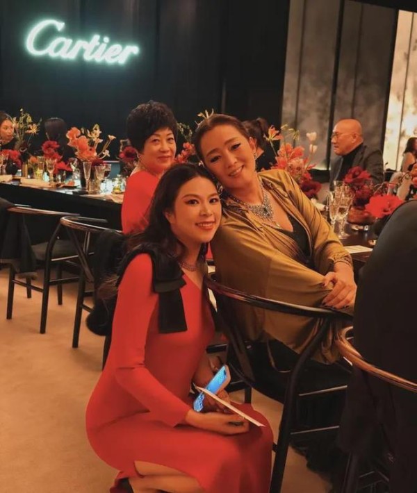 巩俐一如既往的霸气,她身着黑色吊带裙搭配黄色披肩,将头发全部梳起来,留着经典的“大光明”造型,全场她咖位最高,所以和富婆合影时并没有站起来,反倒是富婆“迁就”她,主动跑来她座位前拍摄照片。