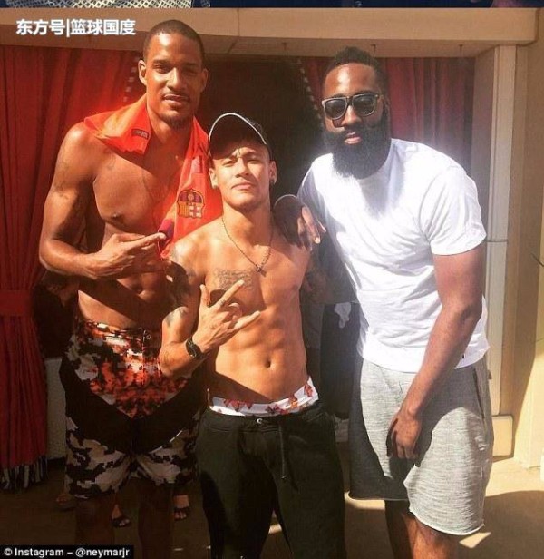 2015年夏天,内马尔在美国度假,他在拉斯维加斯碰见了火箭队的詹姆斯-哈登和特雷沃-阿里扎,当时火箭队正在参加夏季联赛。内马尔与哈登、阿里扎一起合影留念,虽然内马尔在足球场上不算很矮,但他在哈登和阿里扎身边却变成了“霍比特人”。值得一提的是,身高1米96的哈登在合影过程中还有意弯了腰,但仍然比内马尔高很多,这让内马尔显得很尴尬。
