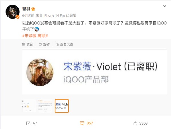 另一名博主 @智羽 也表示,“以后 IQOO 发布会可能看不见大腿了,宋紫薇好像离职了?发微博也没有来自 IQOO 手机了。”
