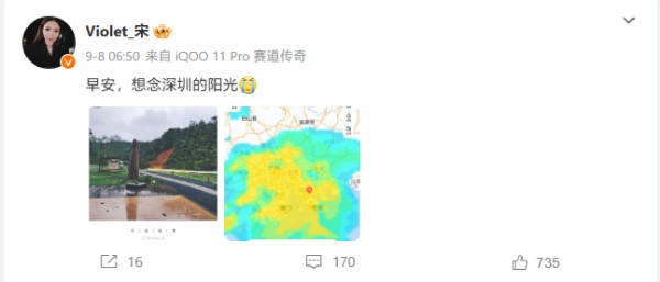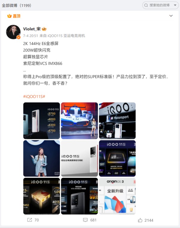 不过,目前宋紫薇个人微博 @Violet_宋 的置顶博文仍是 iQOO 11S 的宣传内容,就在今日发文之前,9 月 8 日的上一条博文仍然配有 iQOO 11 的小尾巴。