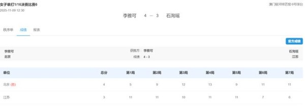 北京时间11月9日,全运会女单1/16决赛,北京队的李雅可4-3逆转江苏队的石洵瑶,七局比分:5-11,9-11,12-10,13-11,9-11,11-7,11-6。也就是说李雅可在大比分0-2落后的情况下扳成2-2,天王山还是李雅可拿到3-2反超,石洵瑶拿下第六局进入抢七,最终抢七石洵瑶崩盘。