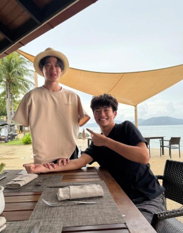 除了杨阳洋,曹格的儿子 Joe 也在香港生活,前段时间三个人还一起聚过。当时拍的照片里,Joe 穿了件黑色短袖,头发烫成微卷,对着镜头笑的时候能看到整齐的牙齿,还是小时候那股活泼劲儿,一看就是阳光大男孩。杨阳洋戴了顶帽子,故意蹲在桌子上和 Joe 拍错位照,脸憋得有点红,16 岁的少年在好朋友面前,还是藏不住那点青涩。