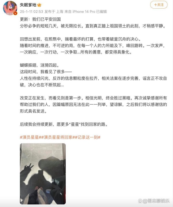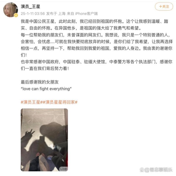 最近,娱乐圈出了个大事,中国籍演员王星在泰缅边境失联,可把大家急坏了,好在最后他平安归来,于 1 月 11 日 00:55 乘机抵达上海浦东国际机场。这事儿一出来,那是掀起了千层浪,不光是粉丝们揪心,整个娱乐圈乃至社会各界都高度关注。这可不是简单的一个明星失联新闻,背后牵扯出的一系列问题,值得咱们好好唠唠。