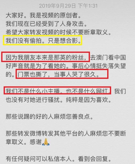 女孩在回应消息中称,并没有偷拍而是想合影而已,女孩的朋友是那英的粉丝,这次来澳门看好声音就是因为她,现在觉得非常失落,门票撕毁了,当事人也哭了很久。